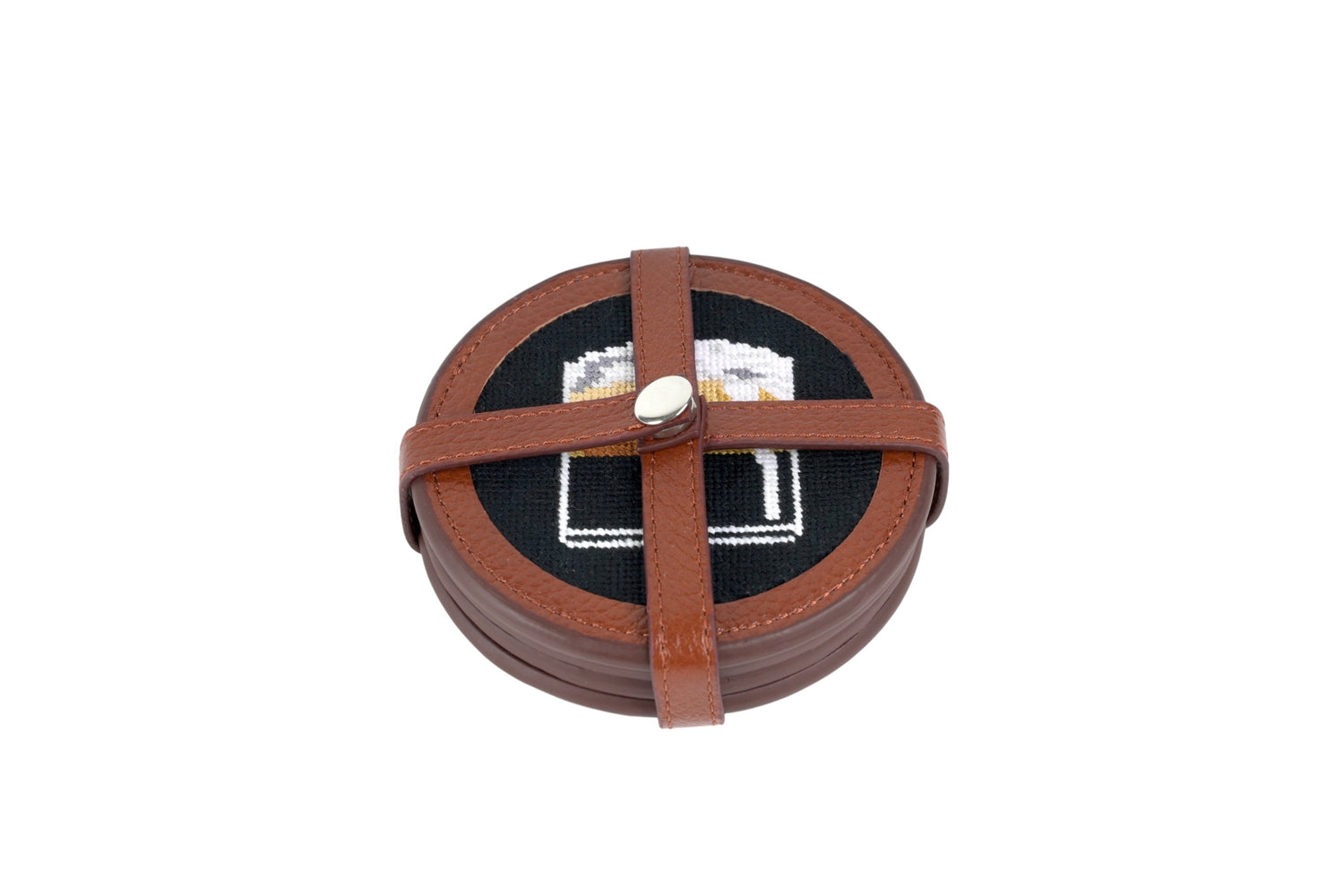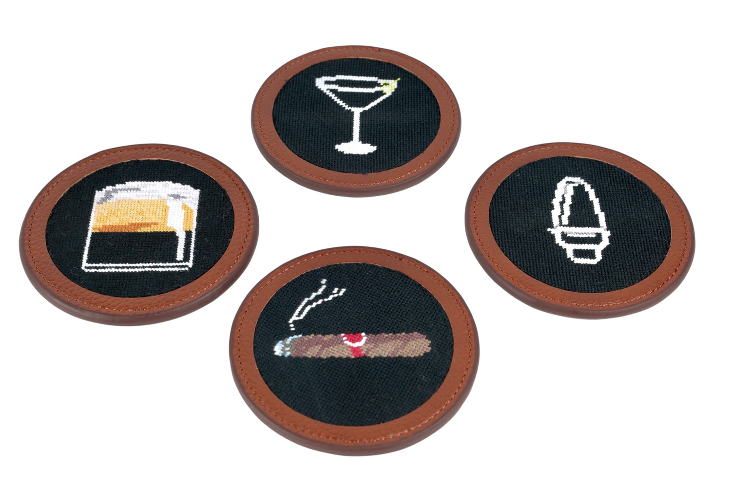 We combined our signature 100% hand stitched needlepoint with full grain leather to create a stylish and lightweight coaster set Set of 4 with leather holder